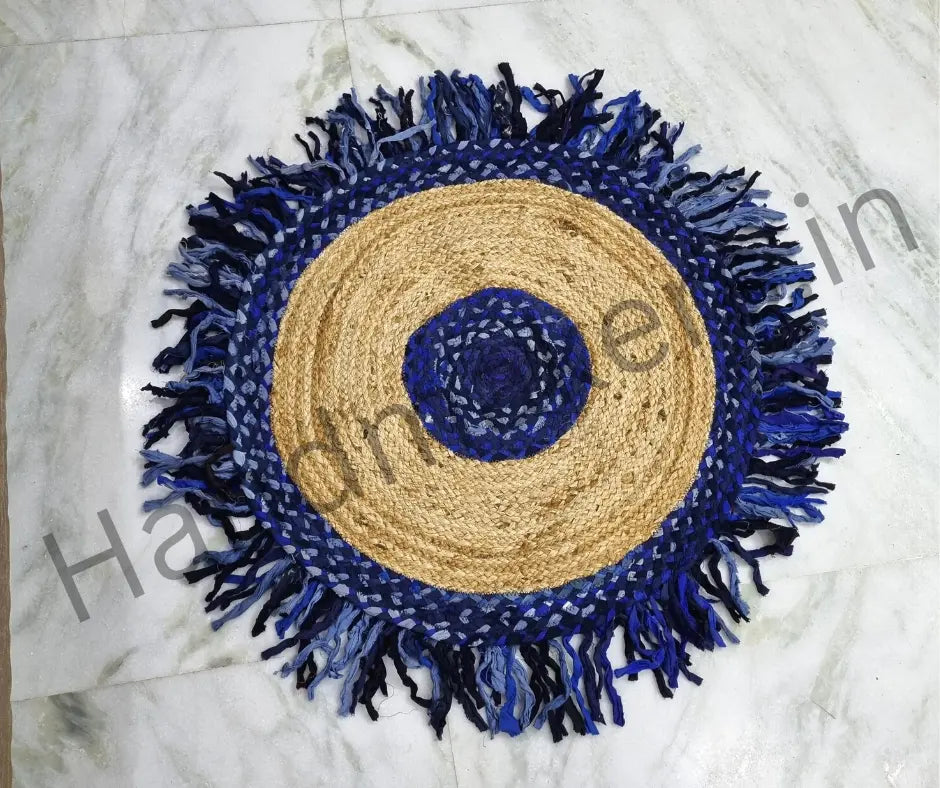 Jute Rugs Pure Handmade Beige With Blue Strips and Cutting Wire