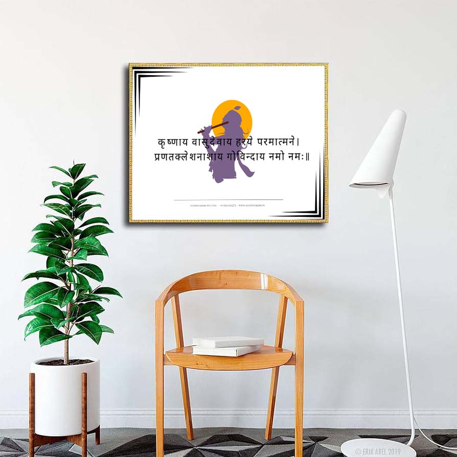 Handmakers Powerfull Krishna Mantra Wall Decor A4 Size Painting with Frame for Positive Vibe for office , Home, reading desk etc